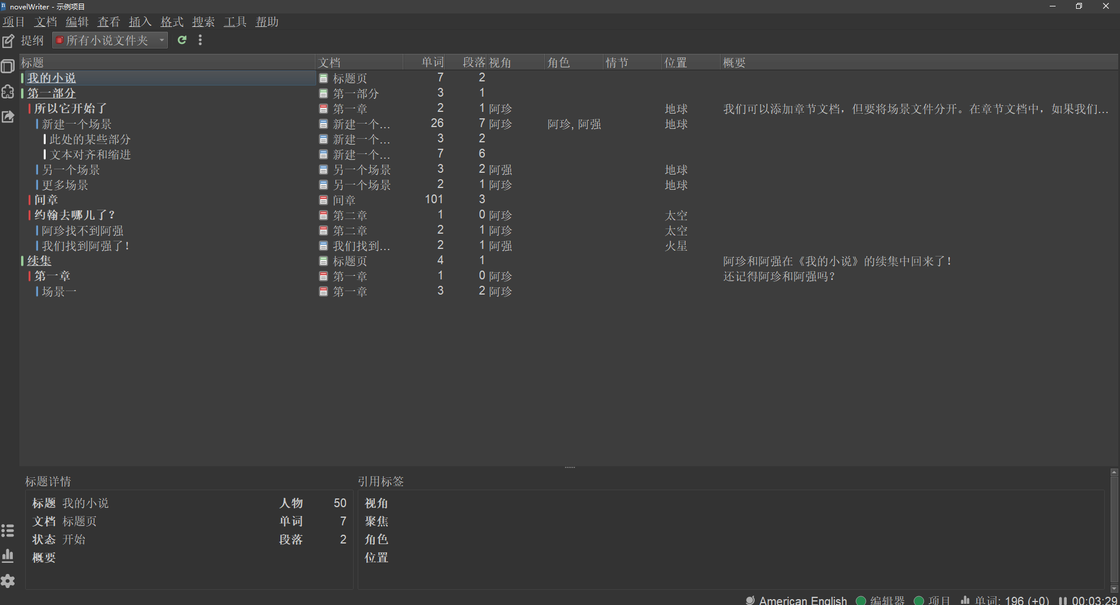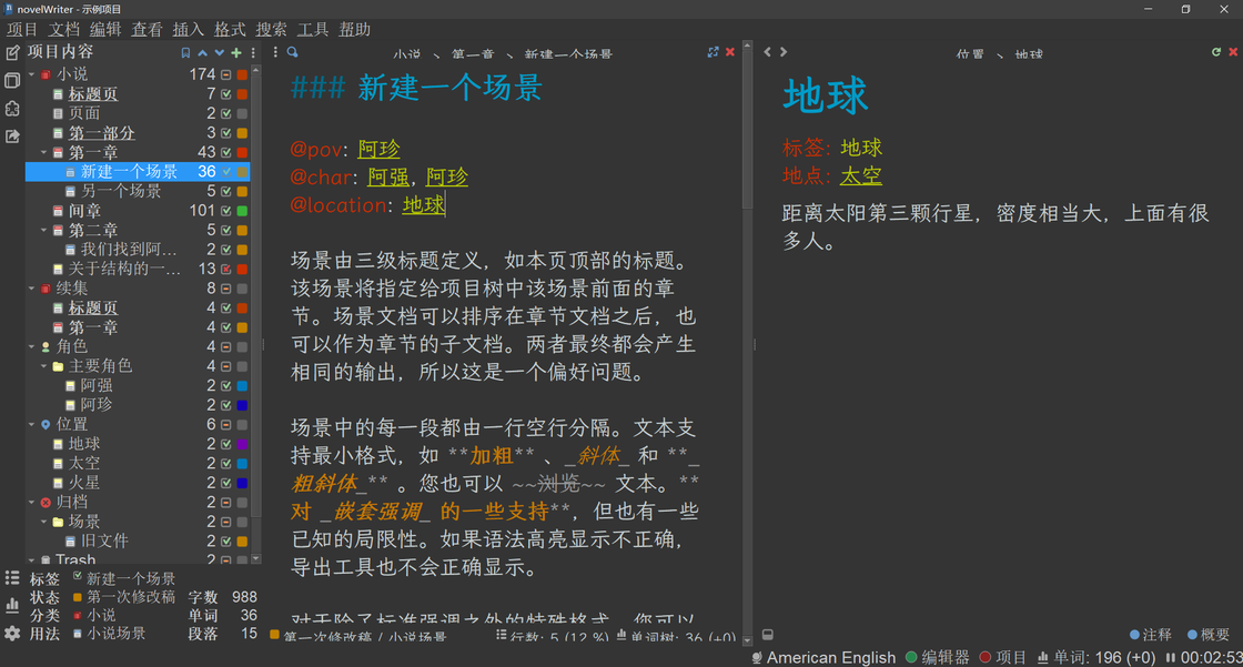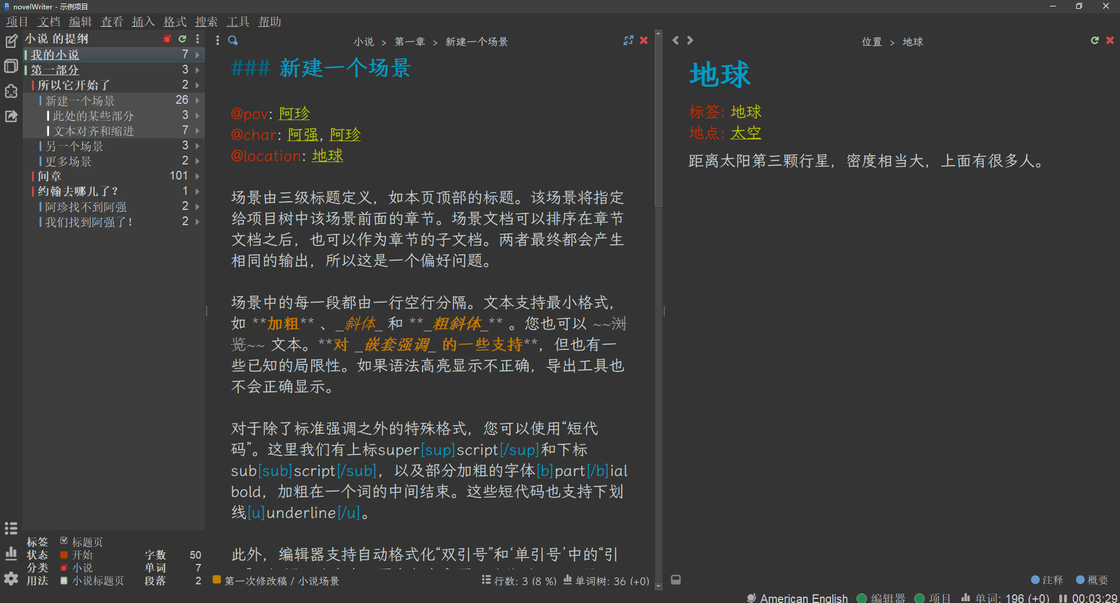 1、另类小说概述 当你根据章节和场景组织好小说的主要部分后,你就可以切换到小说大纲改为查看 小说大纲视图可让您以标题而非文档文件的形式查看小说的完整结构。你仍然可以打开每个章节或场景进行编辑,就像从常规项目树 2、项目大纲 这大纲视图根据你的章节和场景,给你一个完整的小说结构概述 它还在列中显示所有相关的元数据和交叉引用。默认的一组列是可见的,但是您可以通过工具栏中的配置按钮添加更多的列 3、构建和导出 这构建手稿工具允许您将所有文件组合成一个文档。你可以过滤包括哪些内容来制作手稿,起草你的小说大纲,或者将你所有的笔记编辑成一个文档 结果可以打印或保存到HTML,打开文件和降价。这打开文档大多数开源和商业文字处理器都支持format。也可以打印手稿,包括打印成PDF 4、黑暗主题和语法 novelWriter默认使用Qt框架的默认颜色主题。但它也带有可选的标准深色主题。所有主题都有基于典型图标图标集 也有一些用户贡献的主题,您也可以创建自己的主题 此外,您可以为文本编辑器和查看器选择许多亮和暗的语法突出显示主题。这些是从GUI主题中单独选择的,因为它们有很多 5、文档查看器 任何文档,包括您正在编辑的文档,都可以在单独的视图面板中并行查看 6、编辑器焦点模式 在…里聚焦模式,编辑器覆盖了整个窗口,隐藏了项目树和视图面板,以便您可以专注于您的文本 7、跟随链接和参考 标签和参考在检视器中是可点按的,在编辑器中是可点按control键的,因此您可以在书写时快速浏览笔记 在视图面板中打开的文档还会有一个列表,其中包含在参考底部的方框novelWriter使用说明