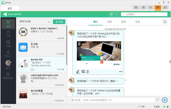 BeTalk是一款非常强大的一站式协同办公软件,通过BeTalk能够做到不同系统应用之间的操作,让系统不再是操作隔阂。不同终端之间的操作,不管您是移动手机,笔记本电脑或是MacBook都能够轻松的连接协同操作。任何时间,任何地点,任何设备,全方位无障碍沟通,BeTalk就是这么强大。还有以“IM”效率来发起音视频会议,将传统电话会议与网络音视频会议完美结合,让工作更加的有效率。再加上强大快速的日程管理,任务管理,能将任何消息、评论、文件、标注一键生成任务,让你的工作方便快捷。欢迎有需要的朋友下载使用。
