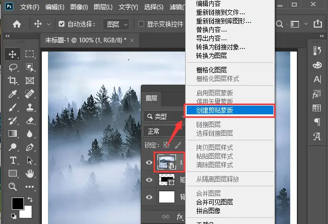 2、我们在矩形上面拖入一张图片,然后右键【创建剪贴蒙版】,如图所示。