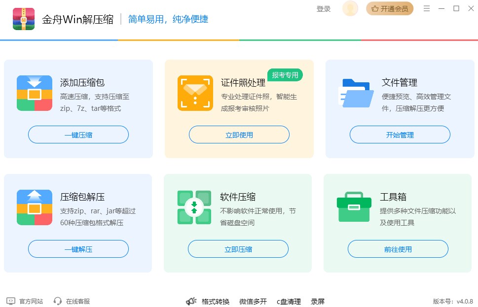1、极速压缩,速度快,体积小 支持主流压缩格式,zip、7z、tar、gz等,多种压缩模式任您选择,支持添加密码,安全有保障。 2、智能秒速解压,格式支持齐全 速度飞快,解压大文件无需长时间等待,支持超60种压缩包格式,方便省心。智能解压缩,寻找文件更便捷。 3、高效文件管理,便捷预览文件列表形式轻松管理文件 支持灵活查看压缩包内文件,文本图片免打开预览,压缩/解压更方便。超便捷的文本、图片预览,选中即可查看。 4、智能软件压缩,节省磁盘空间 智能无损压缩,不影响软件正常使用,一键快捷压缩,拒绝繁琐操作。 5、多种类型文件压缩,都在工具箱里 支持对图片/视频/音频/GIF/PDF/Word/PPT/Excel/进行体积压缩,灵活的压缩设置,满足您各种文件压缩需求。金舟Win解压缩电脑版软件使用教程