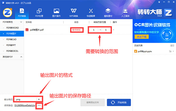 5、在后方的方框中可以输入需要转换成图片文件的pdf文件页码,并在左下方可选择输出的文件格式以及文件保存路径;