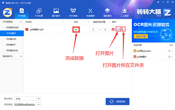7、可以直接从操作栏下的“打开”按钮,打开转换完成的图片文件;或点击文件夹图标,查看文件所在的文件夹位置;