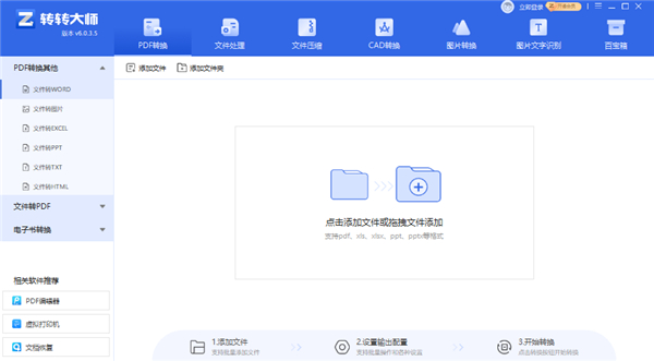 1、支持更多文件格式转换 支持WORD、WPS、PDF、EXCEL、CAD 电子书等格式任意转换 2、100份文件同时转换 一次拖曳上传 避免重复添加 3、无文件大小限制,方便快捷 安全稳定的转换内核 快速处理大文件 4、转换成功率更高,效果更稳定 全新高智能识别内核 准确识别文件字体 字号、图片大小,保留原始排版转转大师pdf转换器电脑版如何转换图片?