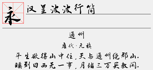 汉呈波波行简字体是一款非常优秀好用的中文行书字体,该字体第一眼看上去就感觉非常的飘逸,字形看上去非常的连贯,带有一点点的潦草,笔画也是棱角分明。字体轻巧简洁,古拙而不凡。粗细匀称,起笔收笔为圆头,折、钩、撇捺转折圆润饱满,具有古拙婉转的气质。可以很好的应用于文本装潢、信息展示、网页设计、篆刻制模、数据制作、装潢设计、计算艺术设计、视觉设计、字帖等一切合法应用场景,有喜欢的朋友可免费下载收藏。