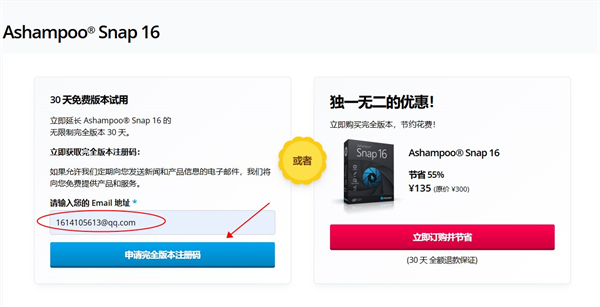 3、在浏览器页面中输入您的邮箱,点击申请完全版本注册码;