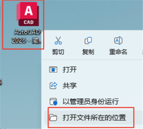 7、在桌面上找到“AutoCAD 2026”软件图标,鼠标右键选择“打开文件所在的位置”。