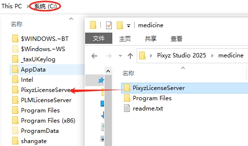 8、将medicine文件夹内的PixyzLicenseServer文件夹复制粘贴至C盘根目录中。