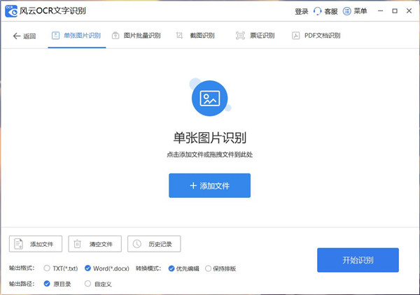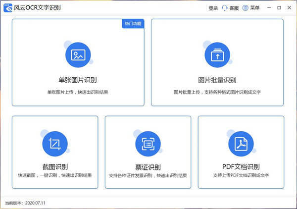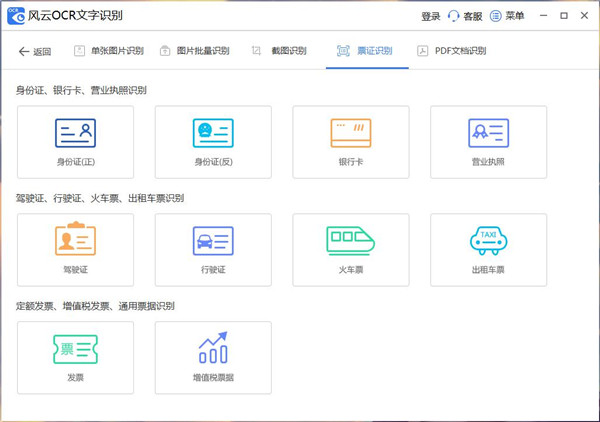风云OCR文字识别是一款功能丰富的图片识别处理软件,涵盖多种操作功能,可以一键识别图片上的内容,快速扫描编辑文字,批量在线处理,帮你节省更多的时间。集单张图片识别、图片批量识别、截图识别、票证识别以及PDF文档识别等五大功能于一体,票证识别里又细分各个小功能,支持身份证、银行卡、驾驶证、火车票、发票等,可一键快速操作识别证件上的内容,并且支持一键复制,满足不同的用户对文字识别的需求。识别准确率高,能够精准识别图片上的所有文字,一键复制黏贴还能提高工作、学习等效率。软件不仅可以将各种格式的图片识别为文字,还支持图片批量上传识别,也可以快速截图一键识别,就连简单的标点符号都能识别出来,同时不会出现乱码,操作效果非常实用,支持多种不同的模式一键切换,有需要的朋友欢迎下载体验。