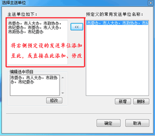 抄送单位:抄送机关指除主送机关外需要执行或知晓公文的其他机关,应当使用全称或者规范化简称、统称。(点击小按钮 选择、编辑、设置发送单位,与主送单位类似)