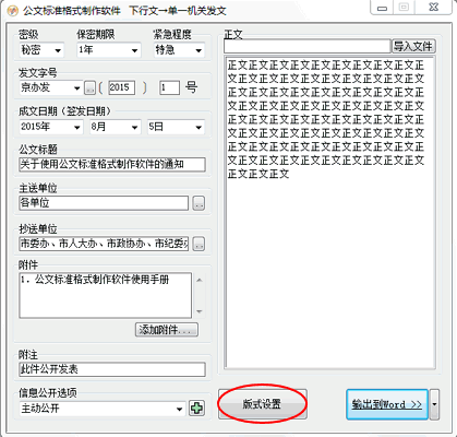 公文标准格式制作软件是一款非常好用且符合国家标准公文格式的公文制作软件,公文是法定机关在处理公务活动中所形成的具有法定效力和规范体式的各类文字材料,所以其格式非常严格且必须标准。而公文标准格式制作软件在公文格式方面就做的极为优秀,也是目前最为好用的。公文标准格式制作软件目前件涵盖了党政机关常用标准格式、联合发文版式、信函式、会议纪要、命令、电传、简报、发文稿纸等常用公文格式。不仅如此,公文标准格式制作软件具有精确定位、格式规范、智能输出、快速排版等功能。并且公文标准格式制作软件操作非常简单,你要做只是输入相关的文字信息,然后便可一键生成文档。