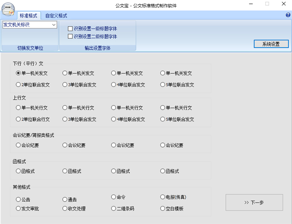 第一步,运行公文标准格式制作软件(机关公文助手),在程序的主界面,请选择相应的行文格式,然后点击[下一步]按钮(如下图)。