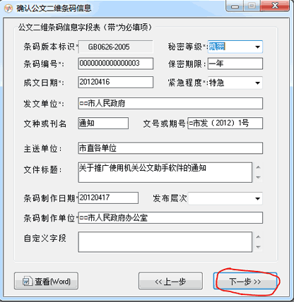 在确认公文二维条码界面,程序将自动调用上一步所包含的信息,请按单位实际情况作补充、调整。各字段填写说明如下: