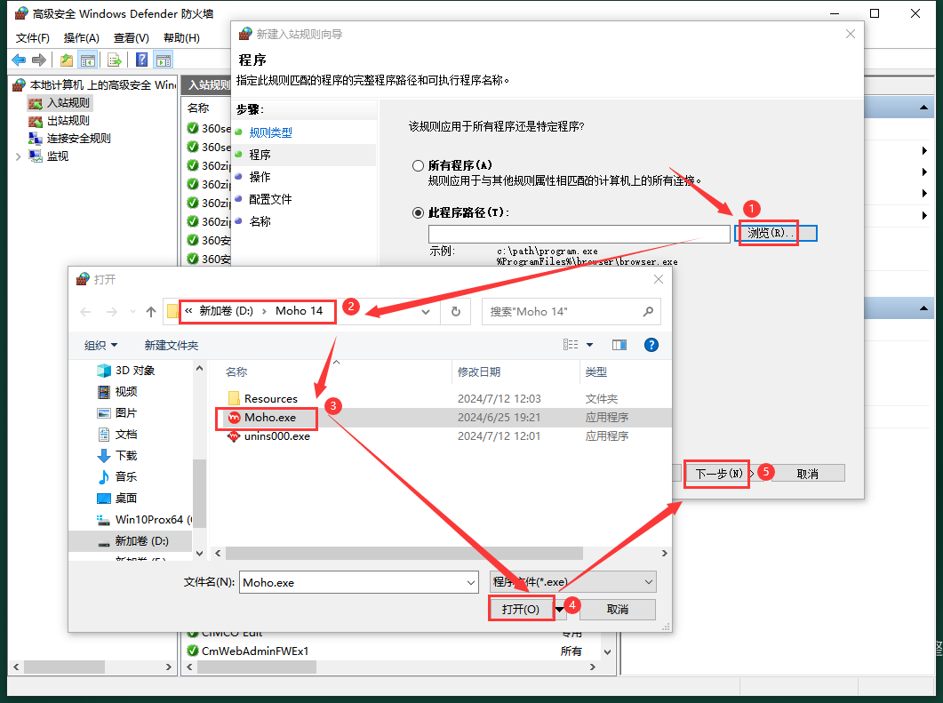 13、选择屏蔽的程序:点击【浏览】-找到软件安装目录位置,选择Moho.exe程序,点击【打开】,最后点击下一步