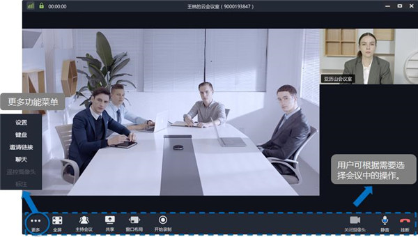 您可在会议中点击视频窗口的工具栏按钮, 选择会议中的操作。