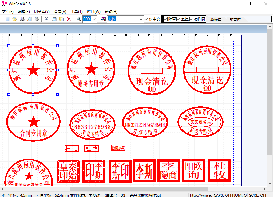 5、自管理、可扩充的印章模板库.用户在winsealxp印章制作可随时把自己的经典设计添加到印章库,也可随时使用印章库的模板来创建新印章.当然,用户与印章库打交道,也完全是在图形方式下进行