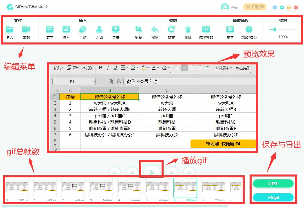 一、GIF制作工具界面说明 Gif制作工具软件使用界面分成“编辑菜单按钮”“效果预览”“总帧数列表”“保存与导出”“播放按钮”几个部分,以下的使用操作说明将从这几个方面来讲解。