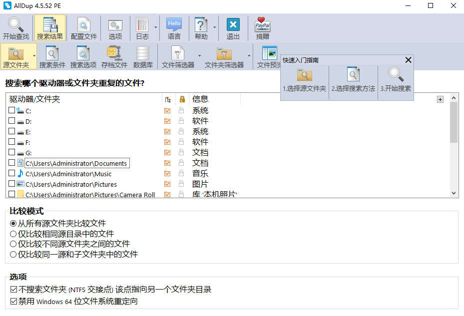 1、强大的基本功能:AllDup是为了找到你的重复文件,让你删除它们,腾出空间,清理你的系统。安装后,您只需添加要搜索的文件夹或驱动器,然后单击“开始”。在搜索过程中赫然AllDup快捷、全面。重复列在组中,并删除它们,您打开任何组,选择您不需要的重复,然后单击“滴答”按钮。 2、优秀的计划能力:AllDup是相当深的计划,和搜索非常灵活。打开“比较法”给你一系列的选择,这是非常有用的。例如,你可能会有重复的MP3文件的不同名称,搜索的大小可能会更成功。 3、高效的搜索功能:AllDup搜索是好的,这个选择的过程是相当冗长的如果你有很多重复。为了安全起见AllDup显示很多的警告让你不删除任何重要文件(虽然你总是可以忽略!),对于更自信的用户,他们可以关闭,这加快了进程。快捷键