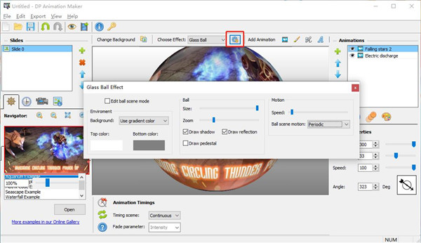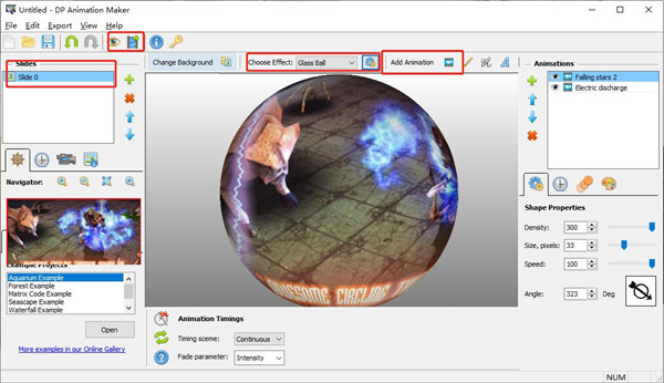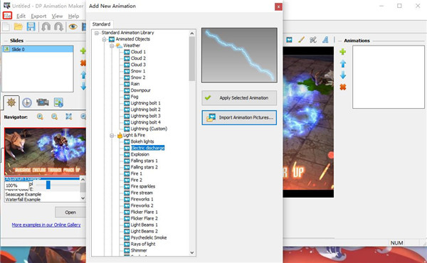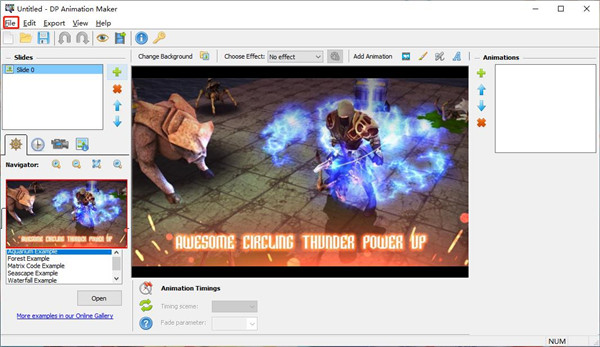 1、支持导出保存为gif、avi、exce等格式 2、拥有丰富的场景和效果供用户选择 3、支持音乐视频的制作 4、可以制作PPT演示文稿 5、支持数字贺卡的制作DP Animation Maker使用方法