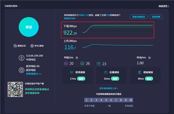 3、如果延迟比较高,可以在本地浏览器测速,看下下载带宽的情况,游戏场景建议20mbps以上