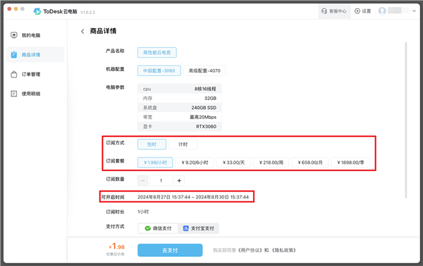 3、选择合适的套餐订阅,点击去支付(注:购买界面显示当前购买云桌面可开启时间,请在有效期内开启使用)