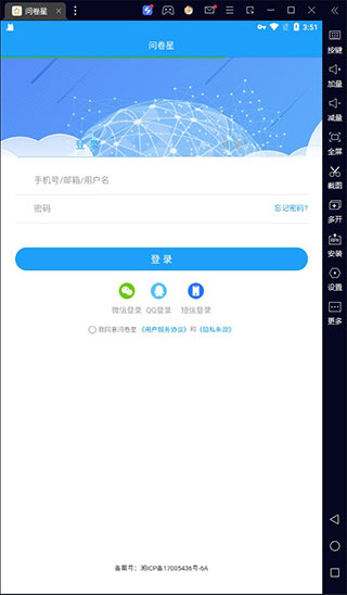 问卷星电脑版是一款通过安卓模拟器运行的问卷调查软件,能够支持在线问卷调查、测评,且为用户提供功能强大、人性化的在线设计问卷、采集数据、自定义报表、调查结果分析系列服务。软件界面简洁,功能强大,支持在线考试、员工360度评估、报名表单系统、在线测评系统等功能。与传统调查方式和其它调查网站或调查系统相比,问卷星具有快捷、易用、低成本的明显优势,已经被大量企业和个人广泛使用。更支持微信、邮件和短信等方式收集数据,数据回收后可以进行分类统计、交叉分析,并且可以导出到Word、Excel、SPSS等,是你问卷调查最好的辅助帮手。
