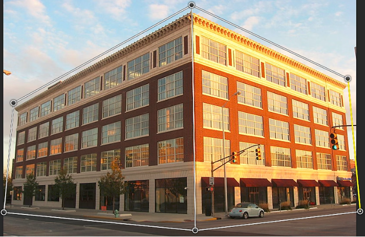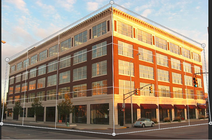 5、适当地在四边形(图钉)的角周围移动。例如,您可以调整此图像的透视,以便建筑的两侧透视按等量缩小。生成的透视近似于建筑从一个角的直视图。
