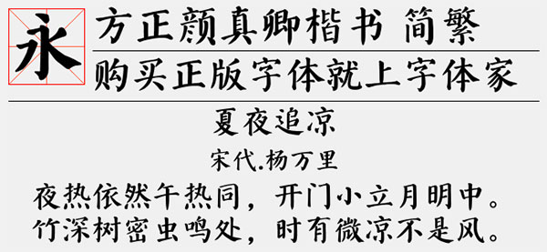 方正颜真卿楷书简繁是一款十分漂亮的中文字体,方正颜真卿楷书简繁由方正字库汪文设计师出品的艺术字体,这款字体以《颜勤礼碑》为字形蓝本所制作而出,字体给人感觉宽博而气势恢宏,骨力遒劲而气概凛然,充分彰显方严正大、朴拙雄浑、大气磅礴的气势。该字体适应于报纸和杂志和书籍中常用字体海报、个性促进品牌标志设计、字体设计、文本装潢、信息展示、篆刻制模英文、数据制作、装潢设计、视觉设计、字帖等一切合法应用场景,有喜欢的朋友可免费下载收藏。