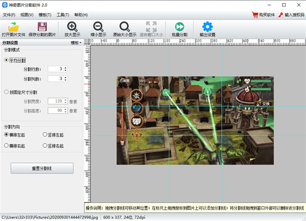 1、支持按行列数平均分割或按指定的尺寸分割两种分割方式; 2、输入图片格式支持市面上所有主流的图片格式; 3、输出图片格式支持JPG/PNG/GIF/BMP四种图片格式; 4、可以设置每个图像块文件名的计数位数;方面将文件名对齐和排序; 5、支持自动生成HTML代码,在浏览器中查看该HTML代码会发现图像拼接的天衣无缝; 6、可以实时预览分割后的效果; 7、软件还支持批量分割模式,可以一键将多个图片按指定的选项分割为多个图像块。使用教程