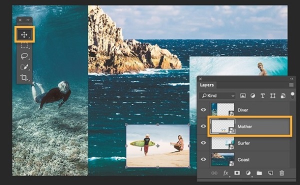 在“Layers”(图层)面板中选择一个图层,然后使用“Move”(移动)工具调整图片在画布上的位置。要调整图片大小,请选中图层,然后按 Control+T (Windows) 或 Command+T (Mac OS) 显示手柄。拖动手柄调整图片大小。调整每张图片的位置,创造独一无二的布局。进行其他调整,直到获得您满意的效果为止。