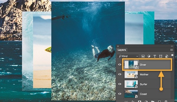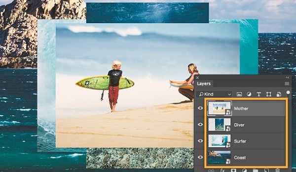 将更多图片拖放到文档中。别担心图片重叠,您可以稍后调整。每张图片都是一个单独的图层,您可以在工作区右侧的“Layers”(图层)面板中看到。如果该面板不可见,请选择“Window”(窗口)>“Layers”(图层)。
