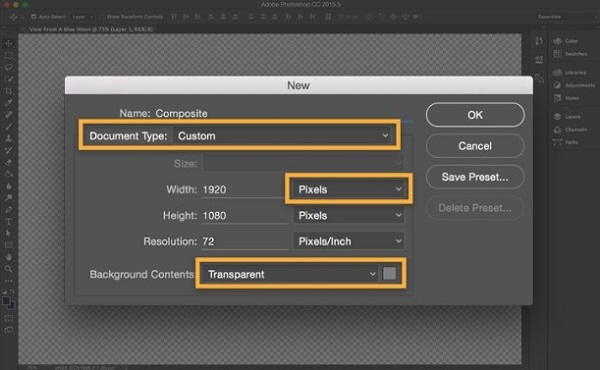 您会惊奇地发现,合成照片和图片,创作您自己的精致美图是多么容易。 1、新建文档 在 Photoshop 中选择“File”(文件)>“New”(新建)。选择一个“Document Type”(文档类型),如“Web”(网页)或“Paper”(纸张)。在线使用的图片以像素为单位。打印图片以英寸为单位。将“Background Contents”(背景内容)设置为“Transparent”(透明)。点击“OK”(确定)。