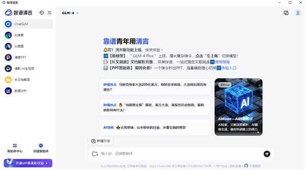 基于当下和未来趋势生活中还是工作中,AI领域涉及越来越广泛,提前融入AI工作模式是必备的!同时智谱清言电脑版上线了【长文溯源】文档解析升级,双屏伴读,一站式搞定文献阅读,【PPT智能体】一个指令秒出PPT,海量模版随心切换。