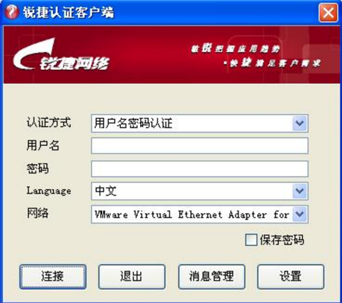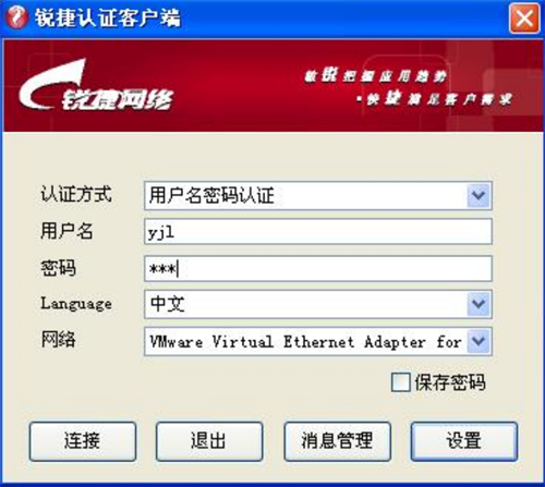 4、 点击“确定”按钮,保存上述设置后即可使用锐捷认证客户端进行认证了,输入合法的用户名和密码。