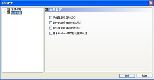 软件设置:该项内容包括“系统登录后自动运行”、“软件启动后自动完成认证”、“系统登录前自动完成认证”、“登录 Windows 域时自动完成认证”四个配置,如下图所示: