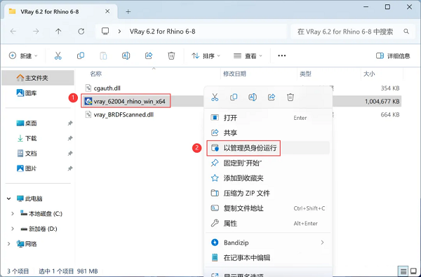1、找到【vray_62004_rhino】应用程序,右键选择【以管理员身份运行】它。