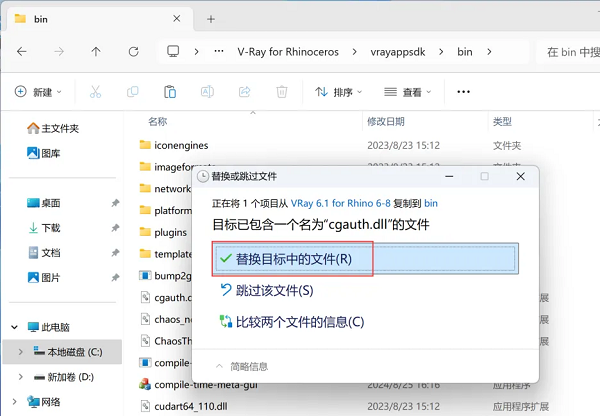 6、回到VRay 6.2 for Rhino 6-8文件夹,找到【cgauth.dll】文件,右键点击【复制按钮】。