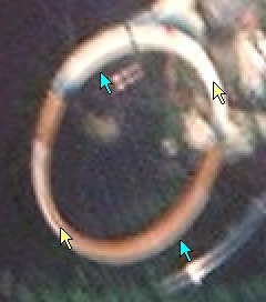 该图像有大量 45 度角的“双点源”,间隔几个像素,如下图的箭头所示。这是另一种类型的运动模糊,尽管它看起来像是某种双重曝光。相机在模糊的两端移动得更慢。如果摄影师在按下快门释放时猛拉相机,就会发生这种类型的模糊。