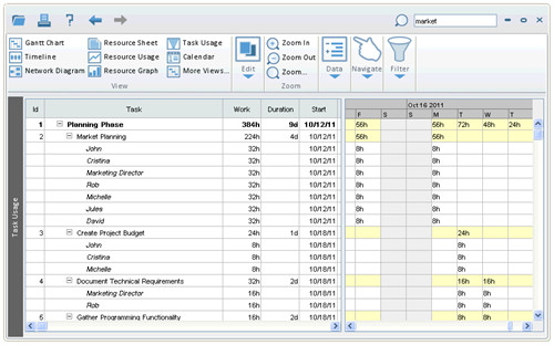 左侧视图显示每个任务的任务ID,任务名称,工作,持续时间,开始和完成。任务行上显示的工作(和工期)是该任务及其所有子任务的总工作(或工时)。任务行上显示的工作是列出资源的该任务的工作量。扩展或收缩任务只会影响该任务。资源行显示特定于该资源参与此任务的信息。