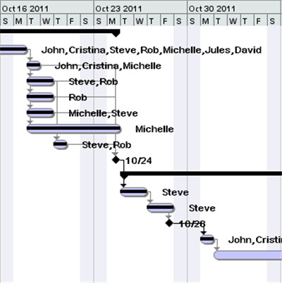 一、【甘特图】 这是项目时间线的直观表示。 您可以放大和缩小(使用菜单或工具栏图标)以更改为其他时间刻度。这是每周视图。图表的顶部显示了按周细分的时间表,并显示了各天。任务的开始日期和结束日期由薰衣草条(任务栏)的开始和结束指示。任务栏上的黑线显示完成百分比。每个任务栏的右侧是“资源名称”。这是首选项,可以在“首选项”对话框中进行更改。箭头指示两个任务之间的关系。周末在此视图中以阴影显示