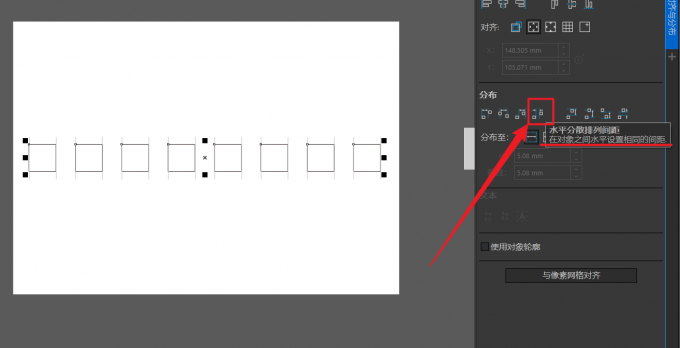 3、将对象保持为选中状态,随后点击“对齐与分布”泊坞窗中“水平分散排布间距”功能,使用后可以发现,正方形之间的间距变得一致,且沿水平轴方向均匀分布。