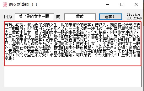 向女友道歉免费版是由吾爱网友自主开发且免费分享的一款道歉信生成工具。它是一款小巧且实用的小程序,通过这款软件,你只需要输入因为什么事情让女朋友生气了,然后输入女朋友的名字,即可一键生成道歉信息,非常方便。女朋友被自己弄的生气了,要怎么道歉才可以让她接受?这是很多情侣都会经历的事情,如果此时的你正在和女朋友吵架或者需要道歉却不知道怎么开口的男同胞们快来看看向女友道歉免费版这款软件.向女友道歉免费版体积小巧,免费实用,有了这款软件之后再也不用担心不知道怎么开口了,也不怕说错话,重复率也不高,不用但心女朋友查重,但是需注意的是不要被女朋友发现了你有这款软件的存在,不然只会更生气,感兴趣的小伙伴可以下载体验一下试试看哦,非常有趣!