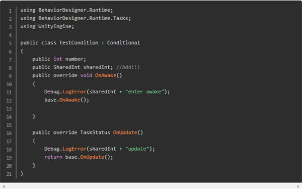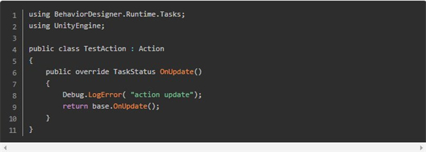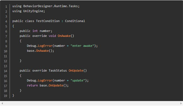 由于插件写的非常牛逼,所以在自定义Condition和Action的时候变得异常方便,只要继承对应的接口,然后在代码里写一些类似unityMonoBehavior的生命周期函数就可以实现了: