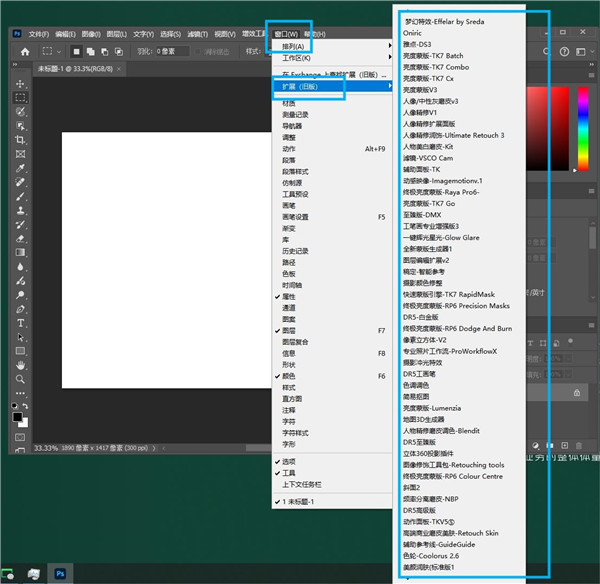6、然后打开PS软件,点击【窗口】中的【扩展】,就可以看到安装的插件。