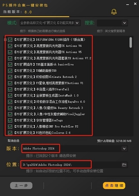 3、选择插件以及自己的PS版本,选择安装位置,然后点击【继续】。