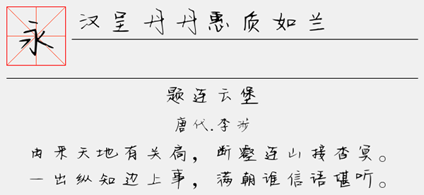 汉呈丹丹惠质如兰字体是由汉呈字库推出的一款十分优秀好用的手写风艺术字体,其字体非常简单和优雅,字形笔画也很随意,并且中英文、阿拉伯数字全面支持,可以很好的应用于文本装潢、信息展示、网页设计、篆刻制模、数据制作、装潢设计、计算艺术设计、视觉设计、字帖等一切合法应用场景,有喜欢的朋友可免费下载收藏。