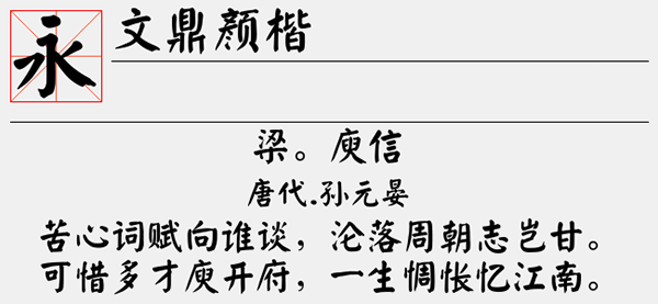 文鼎颜楷体是一款非常漂亮的艺术字体,其字形端庄、结构严谨,给人以稳重、大气之感。文鼎颜楷体在书刊、画册、包装、字体设计等领域中应用广泛,也是报纸和杂志以及书籍中常用的字体。设计师常常使用文鼎颜楷字体来制作海报、标志设计以及字体设计等。要需要的用户朋友欢迎下载收藏。