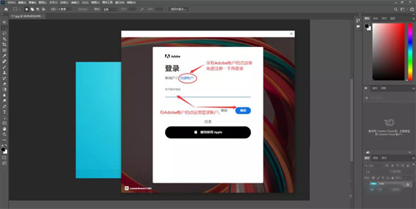 3、登录Adobe账户,没有账户的话点击 创建账户 免费注册一下再登录。(在登录账户后可能会显示PS有试用天数,不要管它,只是显示问题,不影响使用。)