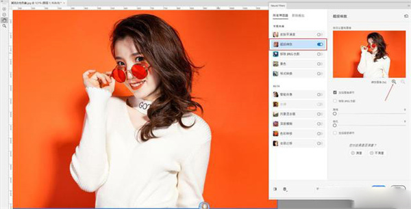 8、打开Neural Filters滤镜后打开超级缩放功能,然后点击缩放图形后面的加号放大镜