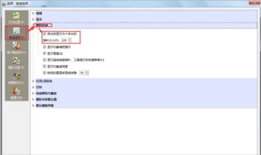 3、下面将介绍一些设置,更改鼠标箭头为十字大光标,选项->系统选项->图形区域->将光标显示为十字光标前打勾,指针大小填100(最大值是100,100时是全屏的大光标,小于100的值时是输入数字长度的大光标。);
