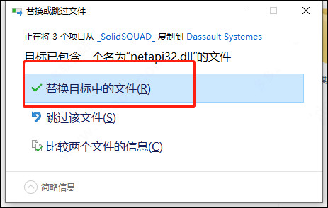 8、先将crack中的DraftSight文件夹复制到安装目录中,点击替换目标中的文件;